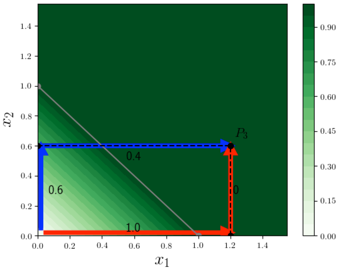 What is nice about extremal paths is that we can easily compute the contribution of each variable along a specific path. In the above example, when moving from the origin toward $P_3$ along the blue path, on the first segment only $x_2$ changes (from 0 to its final value 0.6), and causes $F$ to increase by $0.6$, and on the second segment only $x_1$ changes, and causes $F$ to increase by $0.4$, which results in attributions $(0.4, 0.6)$.