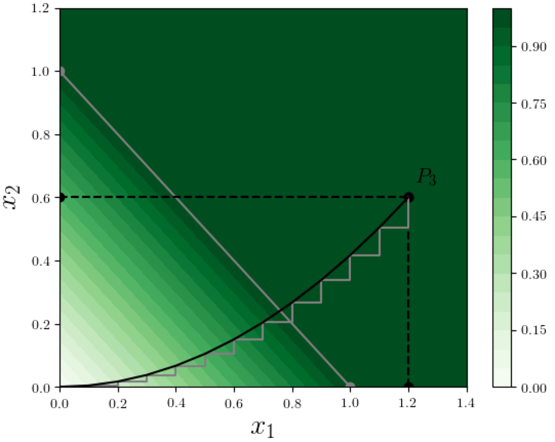 Let's apply the IG method to compute the feature attributions of the function value at $P_3=(1.2, 0.6)$, using the straight line from the origin to $P_3$ in our example where $F(x) = \min(1, x_1 + x_2)$, as shown in the figure below: