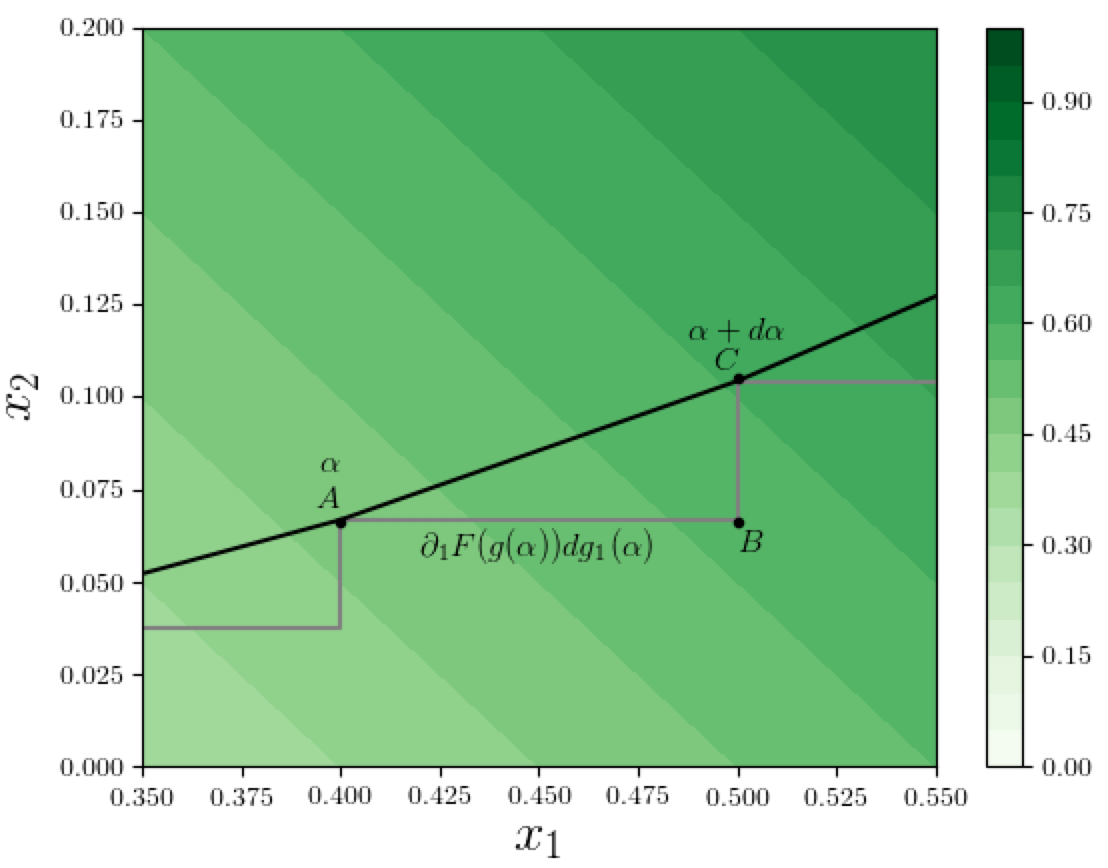 In the above figure, suppose the point $A$ on the path corresponds to path-position $\alpha$ in the parametric path-representation $g$, and $C$ corresponds to $\alpha + d\alpha$ (remember these are infinitesimally-small steps). So the coordinates at $A$ are $g(\alpha)$ and the corresponding function value is $F(g(\alpha))$. As we move along the path from $A$ to $C$, i.e., as $\alpha$ increases by an infinitesimal amount $d\alpha$, the value of the function $F$ changes by a certain amount, and we want to calculate how much the features $x_1$ and $x_2$ contribute to this change. First let's compute the change in $x_1$ when $\alpha$ increases by $d\alpha$. This is given by