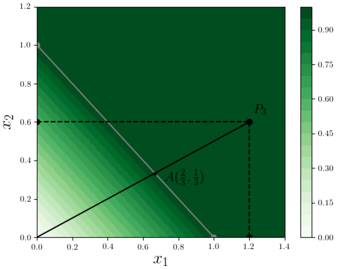 At any point on the path from the origin until $A = (2/3, 1/3)$, the sum of the coordinates is at most 1, so the value of $F$ is essentially $x_1 + x_2$, and therefore the gradients $\partial_i F(\alpha x)$ are 1 for both dimensions $i = 1,2$. Between point $A$ and $P_3$, the coordinates add up to at least 1 so $F$ is saturated at 1, and both gradients vanish. The value of $\alpha$ corresponding to point $A$ is $1/(3 \times 0.6) = 1/1.8$. Thus from the above expression, the IG-based contribution of dimension 1 to the function value at $P_3$ is